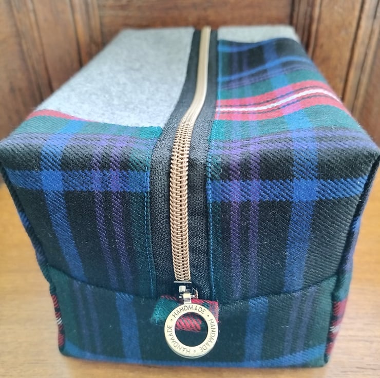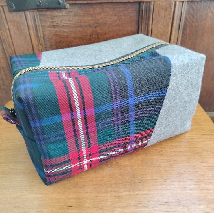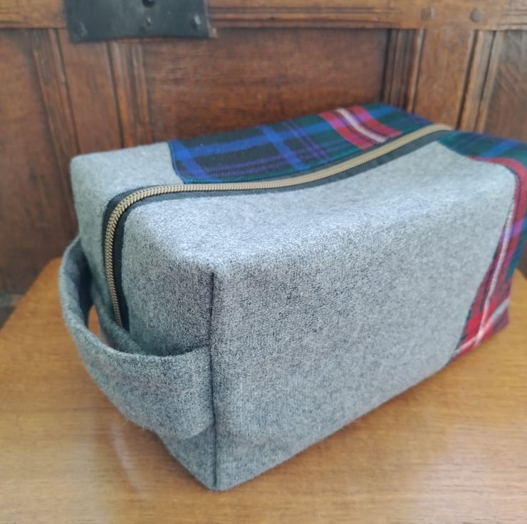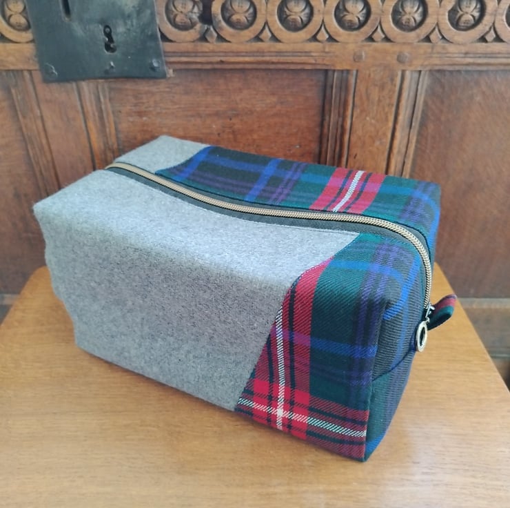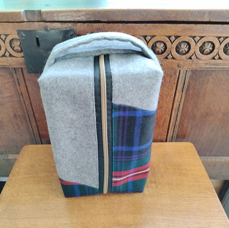 The bag has a grey wool grab handle at one end, and a tartan zipper hold at the other end.