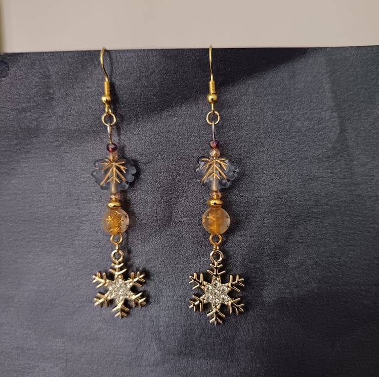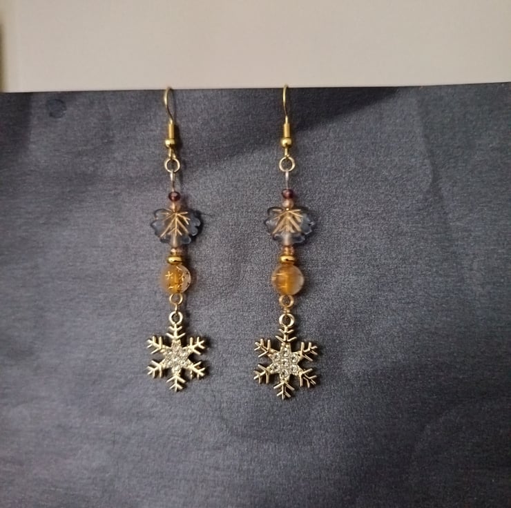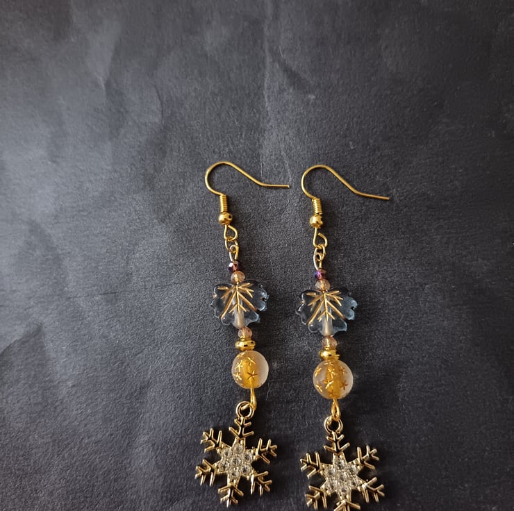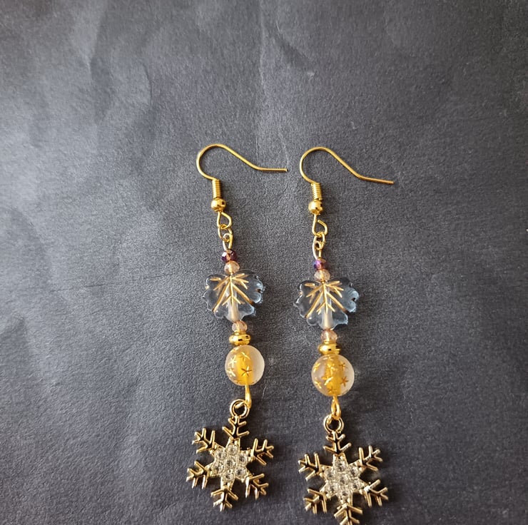 These handmade earrings are crafted with gold coloured stainless steel hooks, gold snowflake charms with diamante detail, frosted glass beads with gold star detail, blue glass leaf beads and small glass beads in pale yellow and purple.