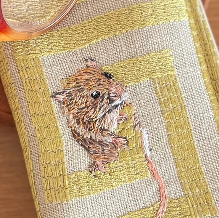 This glasses case has been up cycled from a curtain swatch of a taupe fabric with a square pattern of green/yellow textured stripes and has a hand embroidery of a mouse climbing up one of the stripes.