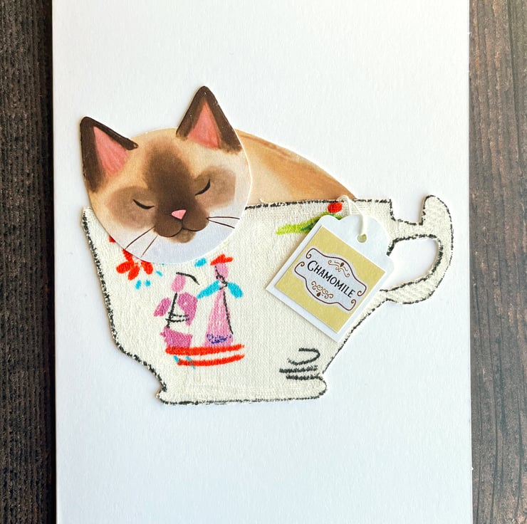 Siamese cat, handmade cat card, card for cat lover, cat in a cup