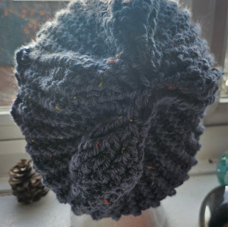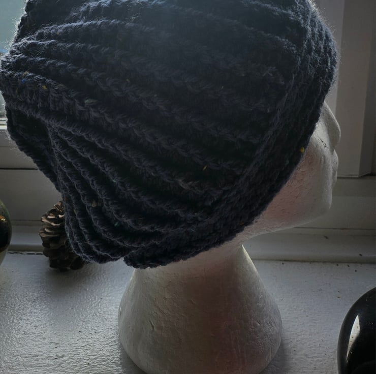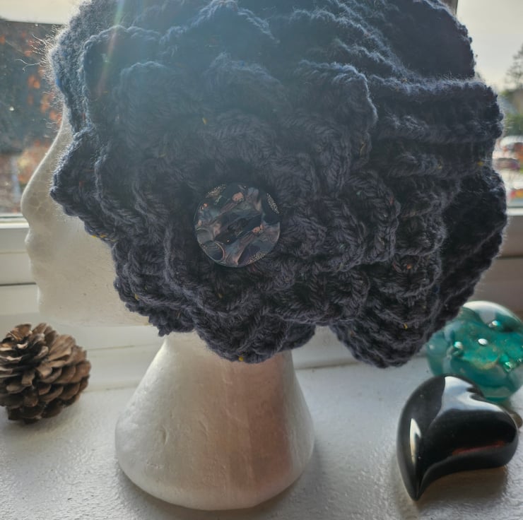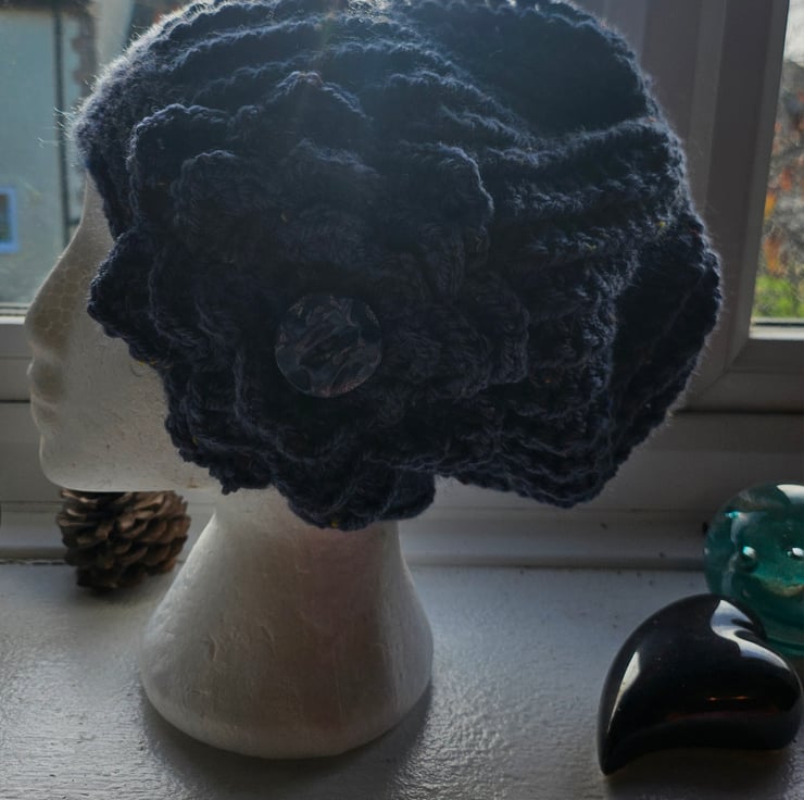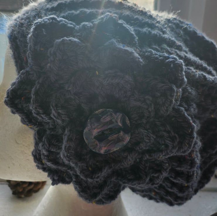 Beautiful crocheted Flapper Style slouch beanie hat with large flower motif. Guaranteed to keep you warm with Style.