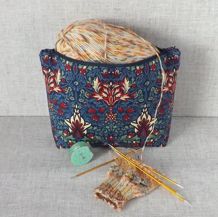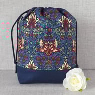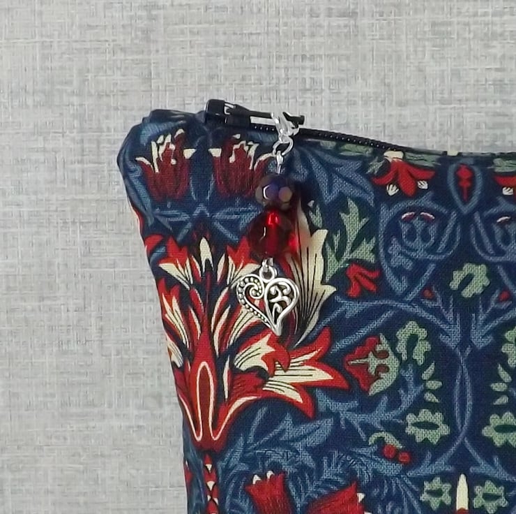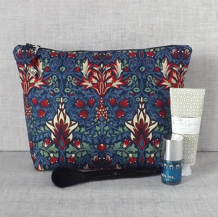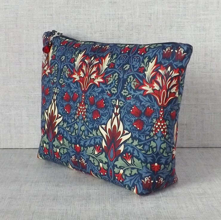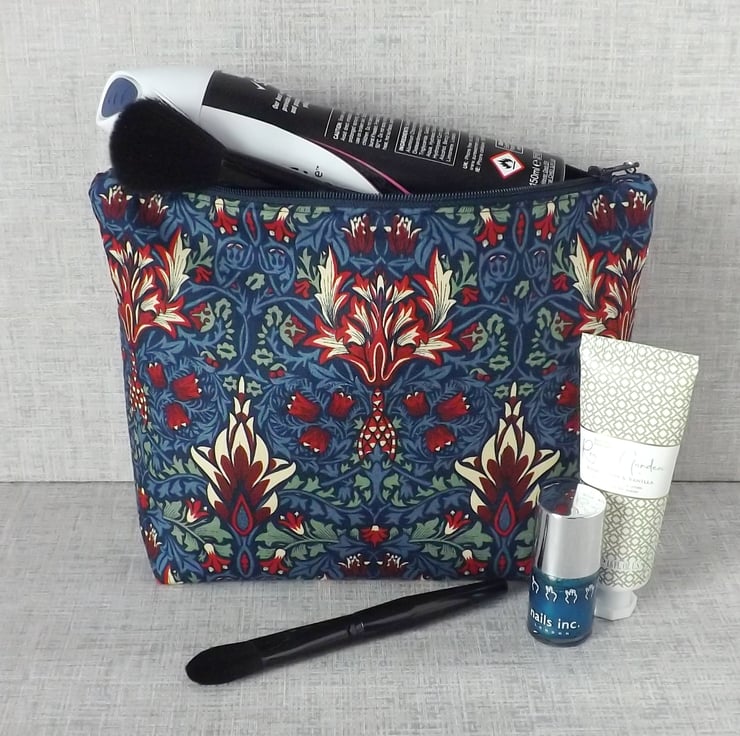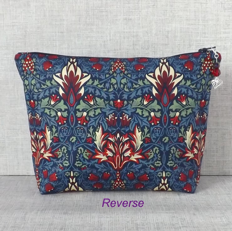 A large sized zipped pouch, cosmetic bag, made from a lovely cotton fabric from the William Morris 'Winter berries' range, in shades of blue, dark red, green & cream. The lining is plain navy blue cotton.