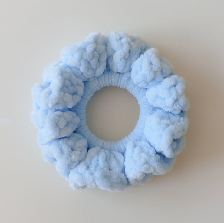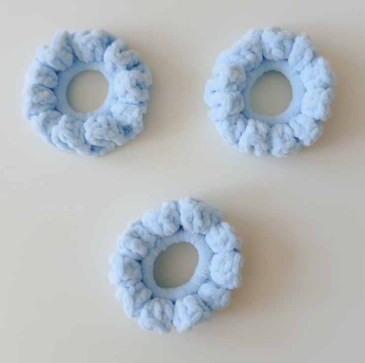 Yarn and colour: The scrunchies are crochet using James C. Brett Flutterby chunky yarn in shade sky blue. The yarn is supersoft with a velvet feel, 100 per cent polyester.