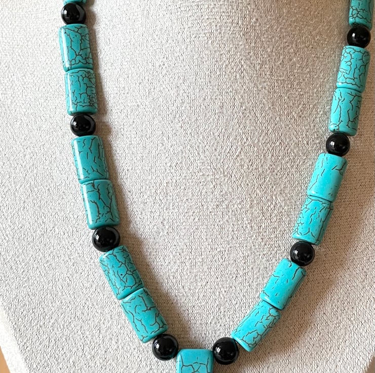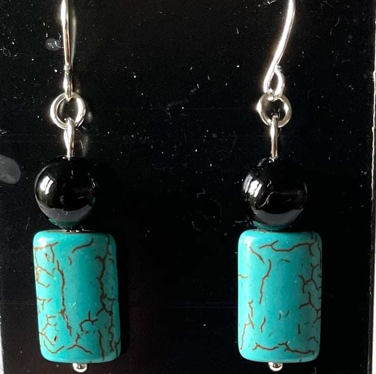 Beautiful and unusual turquoise cross pendant and earrings set. The turquoise oblong beads are interpersed with round jet beads. The earrings have an oblong turquoise bead with one round jet bead. The necklace fastening is Silver plated and the earring wires are also silver plated.