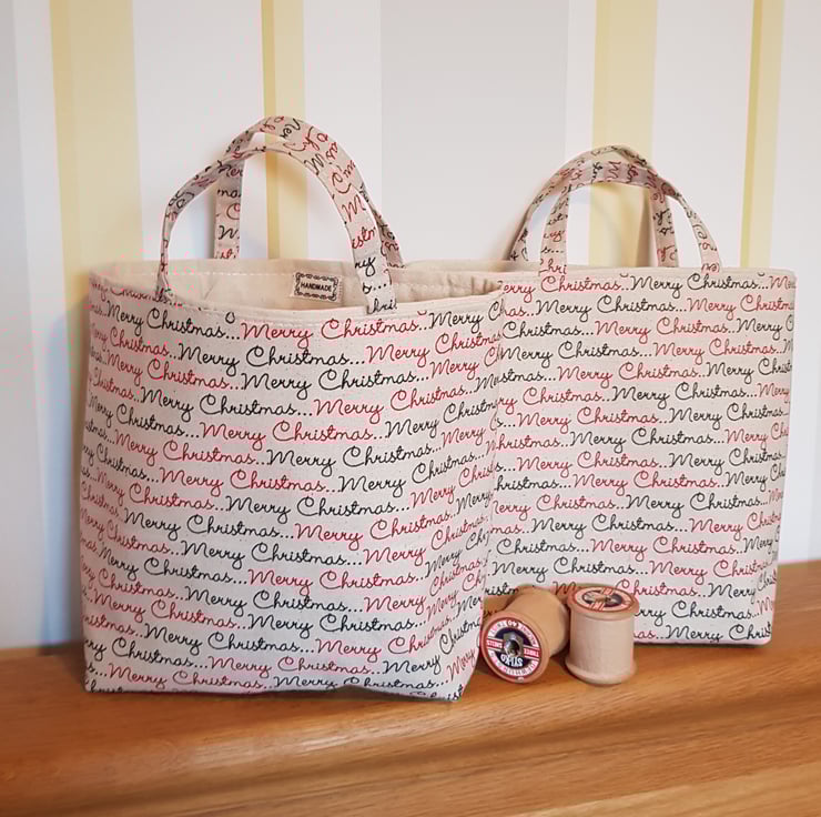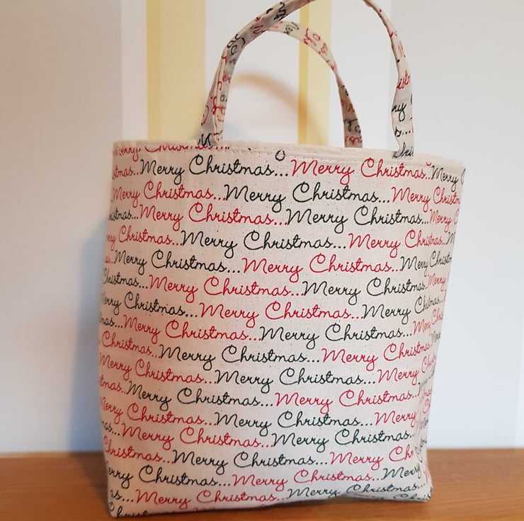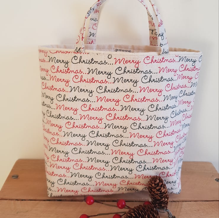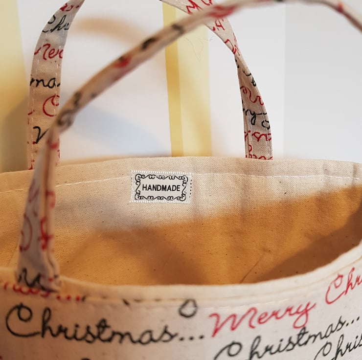 Sustainable and reusable, this little bag is ideal for popping in a small gift, or two. It measures approx 7" x 7": 18cm x 18cm and 2" , 5cm at the base. I have chosen a good quality cotton fabric , the bag is lined with cotton calico and is interfaced with a recycled interfacing so it won't flop.