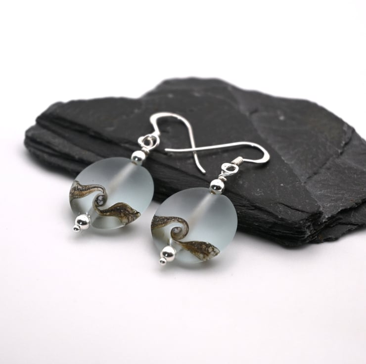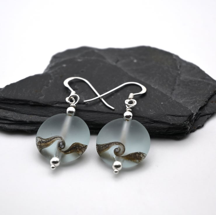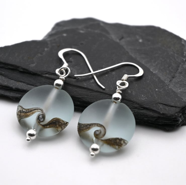 A pair of sterling silver earrings featuring pale blue frosted glass lampwork beads which have been wrapped with an ivory swirl.