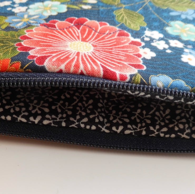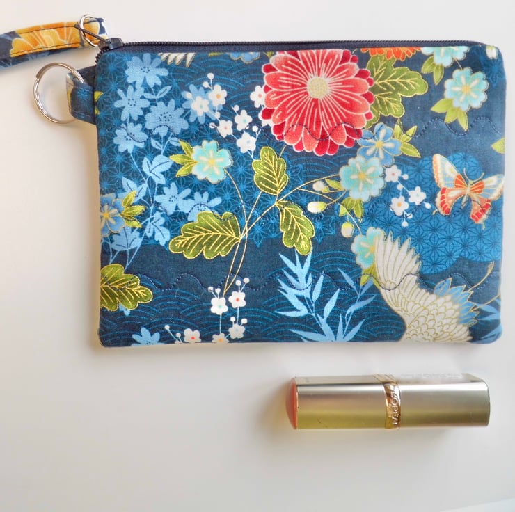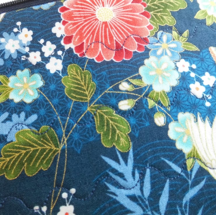 This zipped purse is made using a beautiful Makower quilting cotton. The fabric has a dark blue background and the Japanese inspired print of florals, cranes, and butterflies has delicate touches of metallic gold. I backed the fabric with fusible fleece and machined three lines of wave stitch on each side in dark blue thread to give it extra body and a quality feel. It is lined with a vintage Laura Ashley ditsy cotton print.