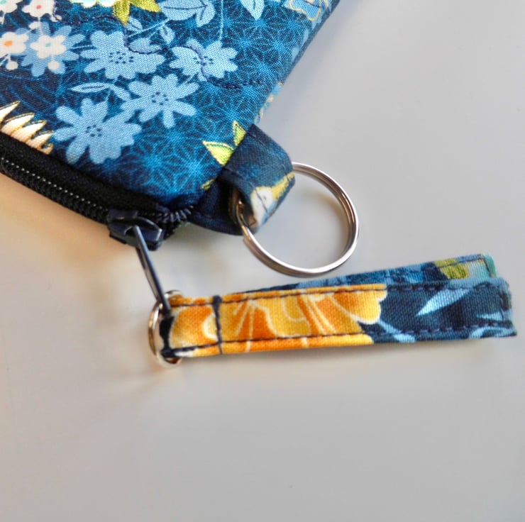 Flat style with a navy blue zip across the top which is finished with a fabric tab. There's a key ring attachment inserted into one side.