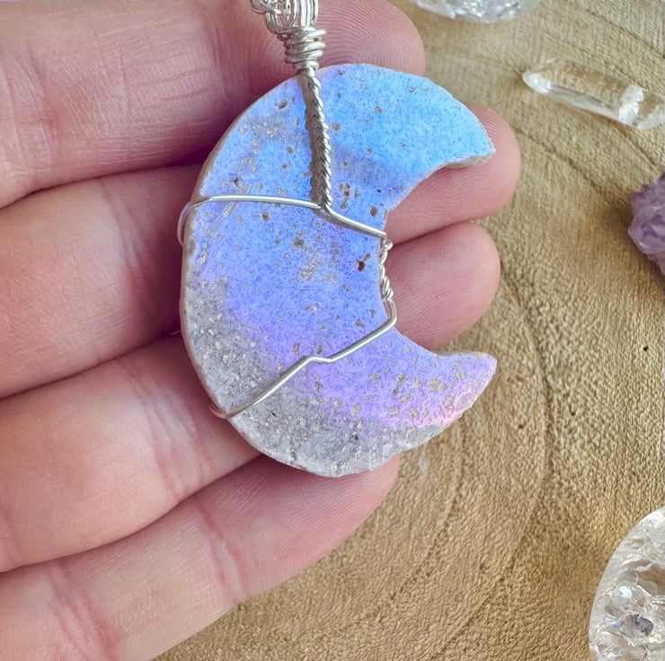 These Pink Amethyst moons have a magical iridescent Angel aura coating on one side of the crystal.