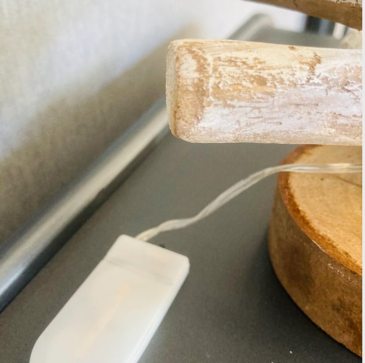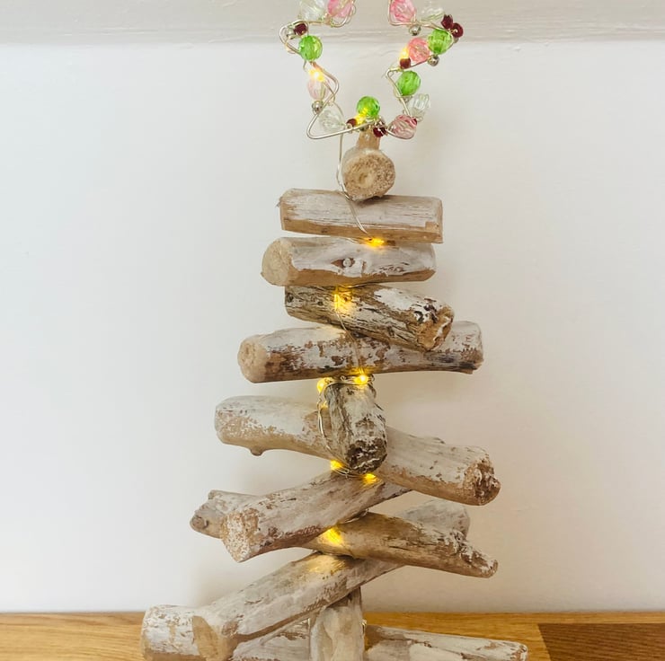 This christmas tree comes with battery mini operated wire fairy lights and stands 30cm tall and stands on a eucalyptus log base.