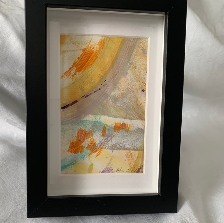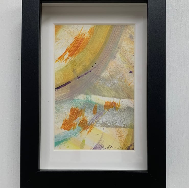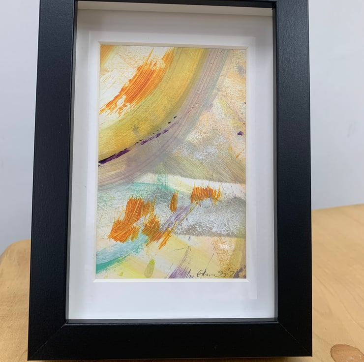 This original abstract painting is presented ready framed in a 10cm x15cm frame, suitable for directly hanging on a wall, or standing on a desk.