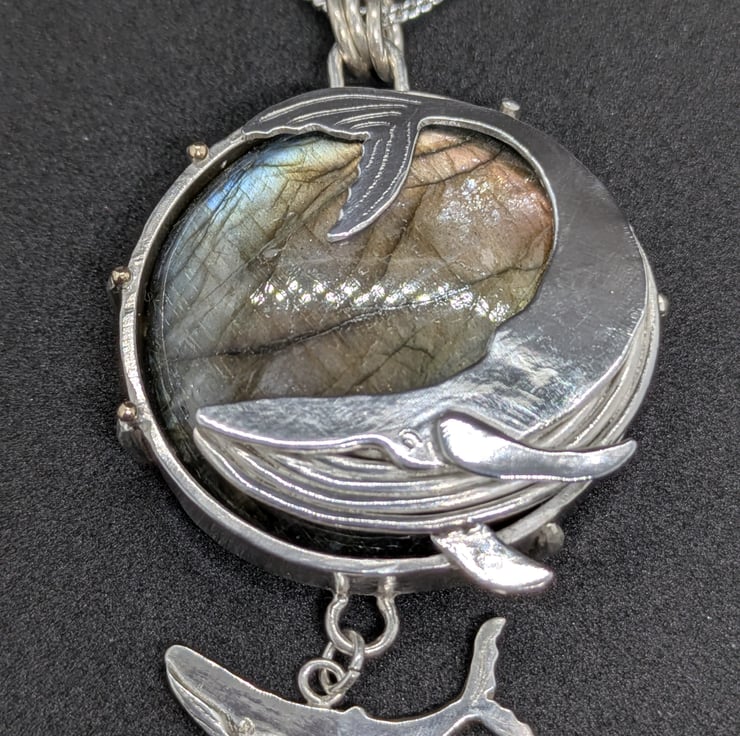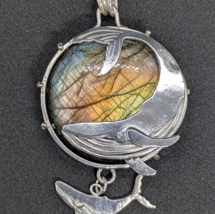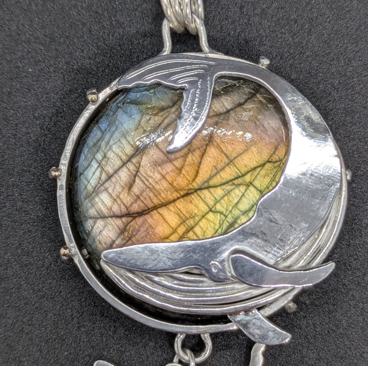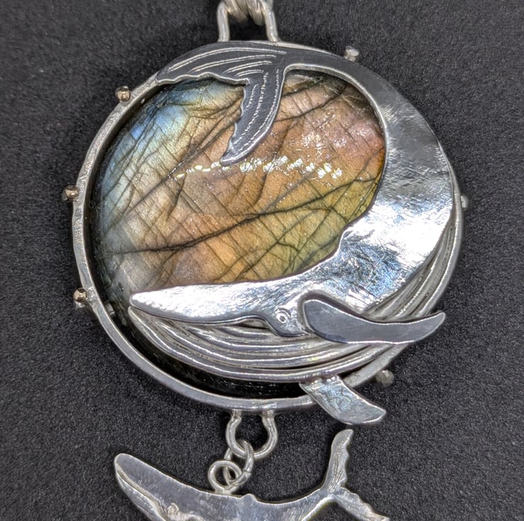 This one of a kind pendant has been entirely handmade. The labradorite stone has been set in a substantial sterling silver setting with six prongs. A graceful hand saw pierced sterling silver whale sweeps across the front of the pendant and their calf swims calmly below. The labradorite has green, blue and sometimes yellow flashes, reminiscent of the depths of the ocean. Silver prongs bend around the back of the pendant to encase the stone and a tiny granulated 9 carat gold ball sits on top of three of them. The pendant measures approximately 3.6cm in diameter. It is designed as a substantial piece for people who like their jewellery to be noticed. It would make a special and unique gift.