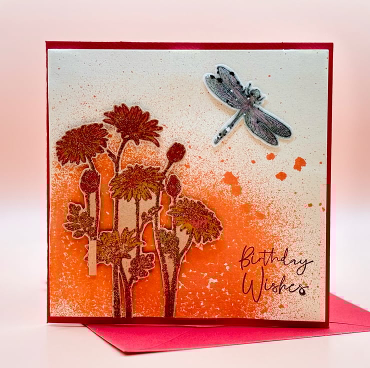 Sitting on a red card base, is a artistic scene that brings together all of the classic colours of autumn. The trimmed cream card has been sprayed with 'Crackling Campfire' Distress Oxide spray, creating a scattered ink effect.