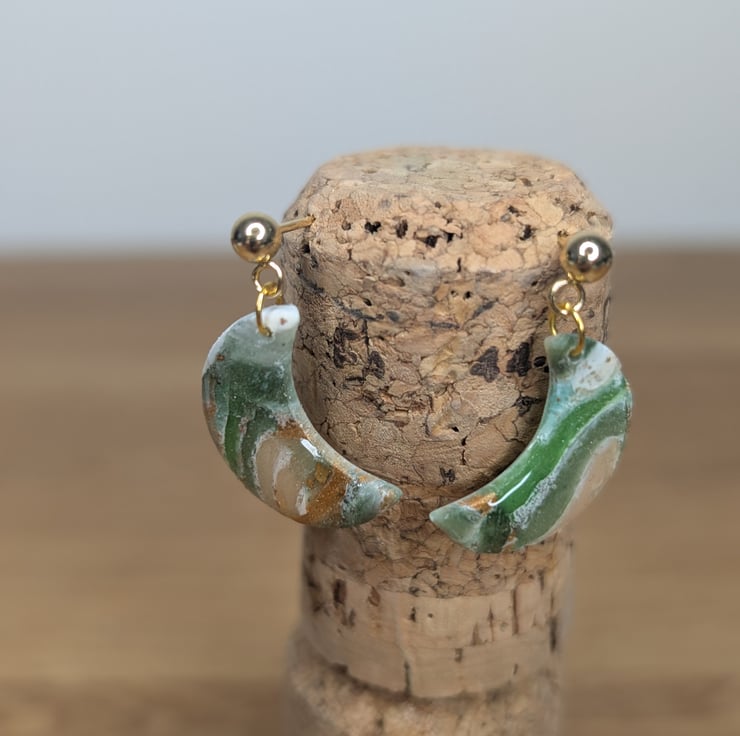 Hand made polymer clay earrings with a marble pattern of transparent /green polymer clay, white acrylic paint, and gold flake. fixing is hypoallergenic. Please see all photos for close up detail. All products handmade therefore there may be minor imperfections. Sold as seen, message for more info