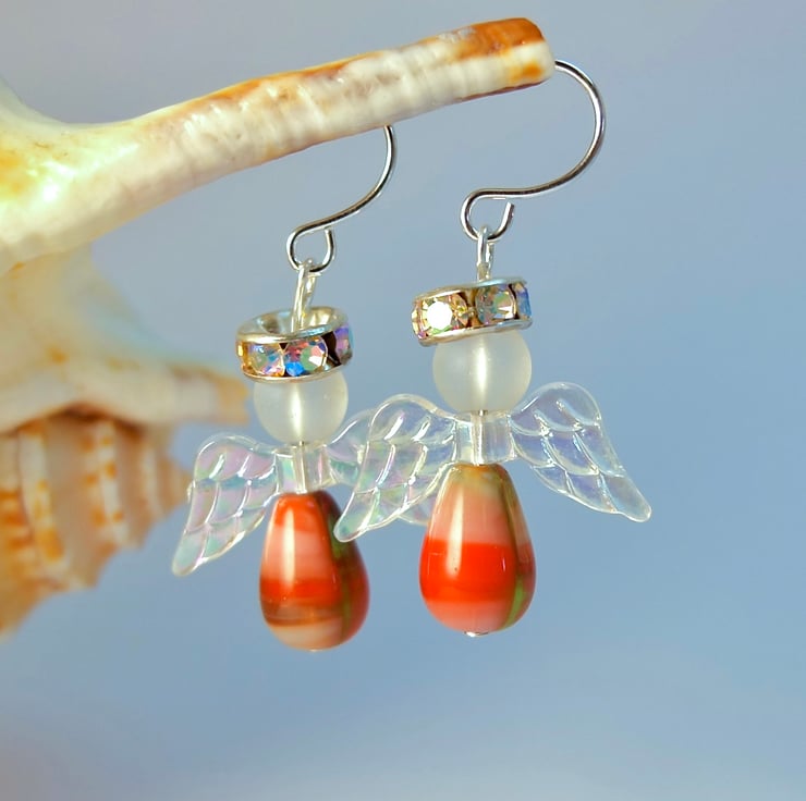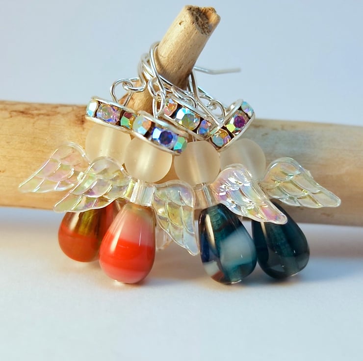 Each sweet little angel wears a colourful Czech glass teardrop as a skirt, shimmering clear acrylic wings, a frosted glass bead head and a sparkly rhinestone halo.