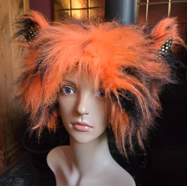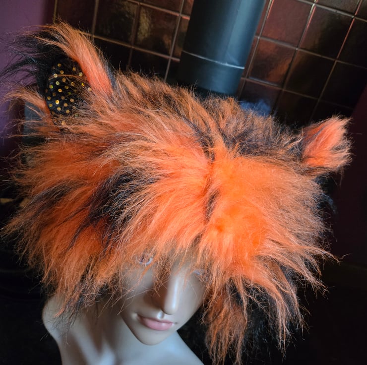 Psychedelic Rave Punk Shaggy Long Faux Fur Ears Hat Orange Black One of a Kind