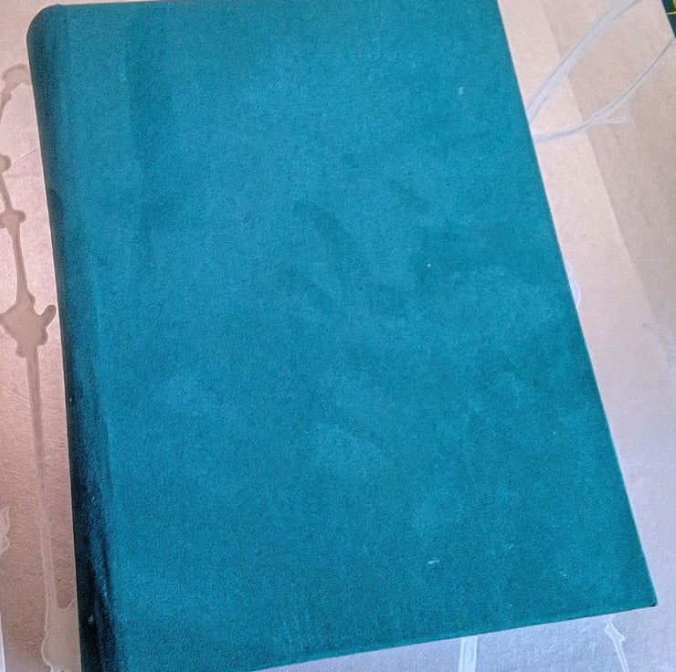 The book measures 8.5 inches by 6.5 inches. The book feels good in your hands, the cover fabric is soft to the touch, and I think that this will become a beloved companion to whichever lucky person receives it.