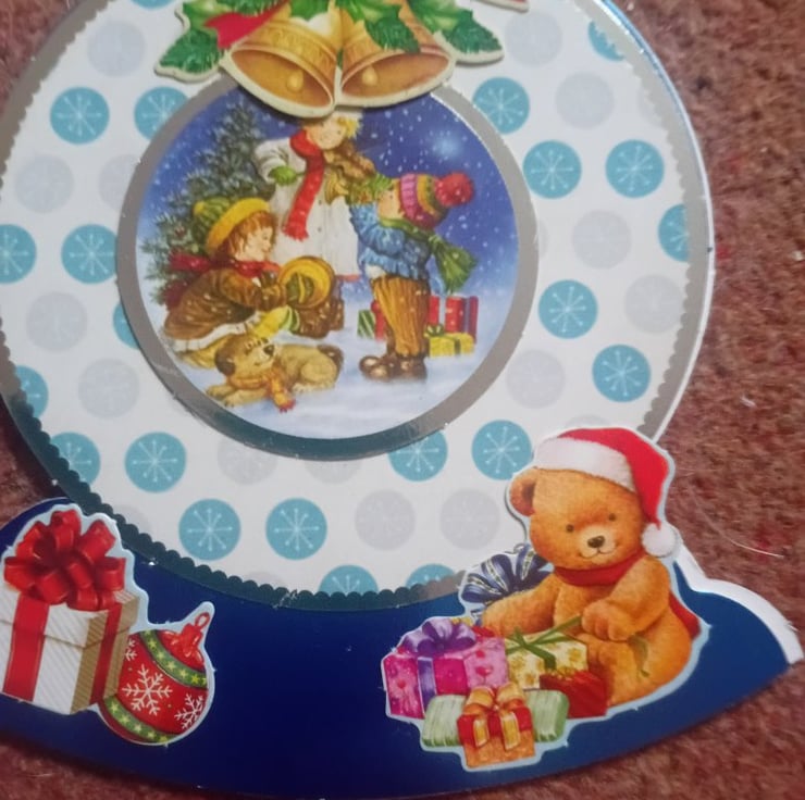 handmade shaped rocker card, deep blue with a front image of a bear surrounded by gifts and Christmas foliage. has a Merry Christmas greeting. On the reverse are more bears and gifts with an envelope and wrapped