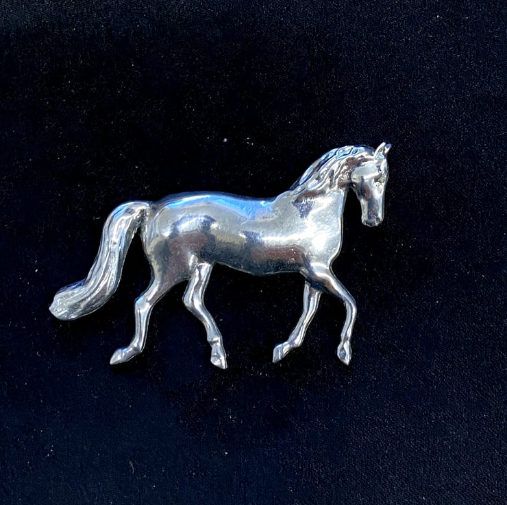Hand polished pewter Horse brooch cast in Cornwall ( the home of pewter and tin ) finished in Scotland.