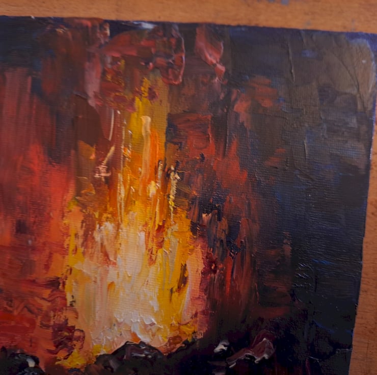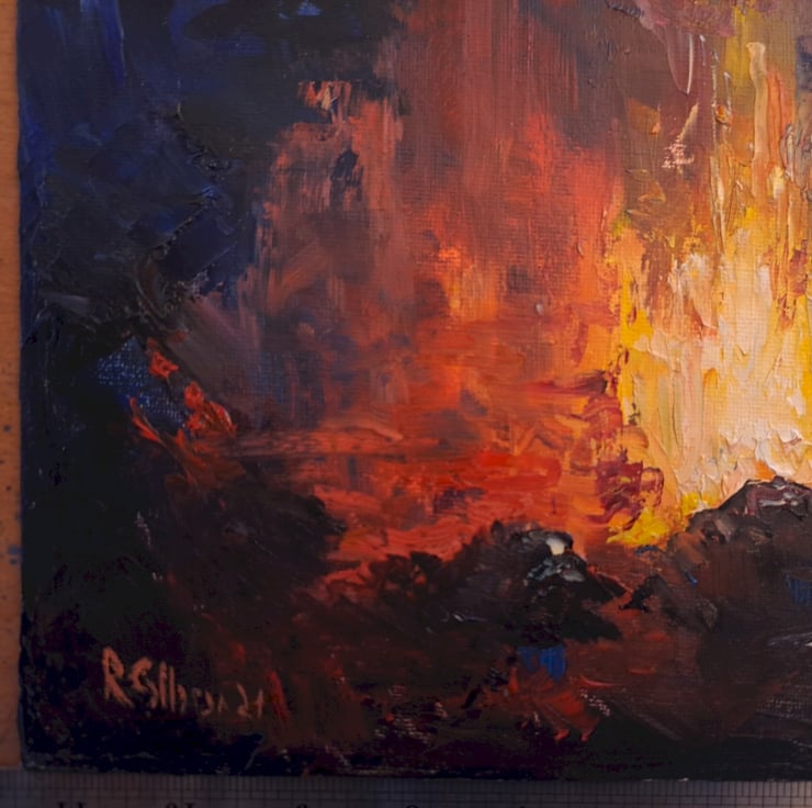 Image of volcanic eruption in a high contrasted depiction.. Painted in Oils on 3mm canvas panel.