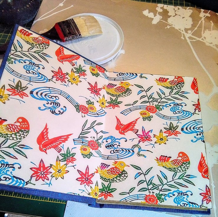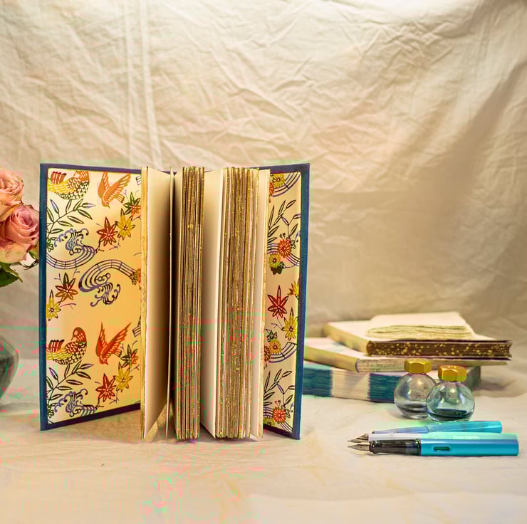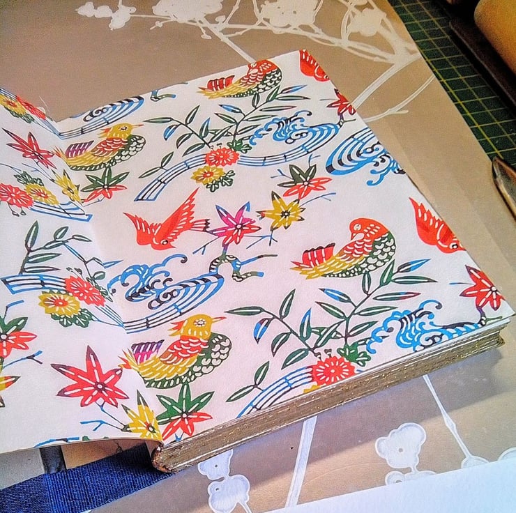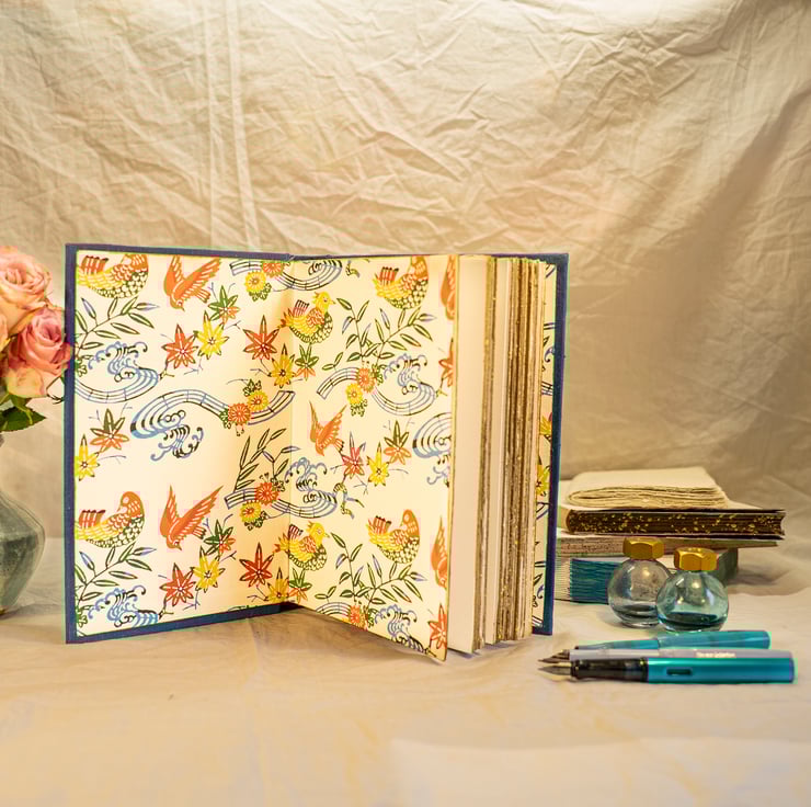 The endpapers are Katazome-shi paper with a print called Birdsong. "Katazome-shi" literally means stencil-dyed paper. Based on traditional kimono printing techniques these Japanese papers are stencilled by hand to produce unforgettable, intense colours and patterns.