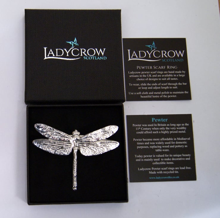 Designed for silk and lightweight scarves this Dragonfly scarf ring has a loop on the back through which to slide the scarf.