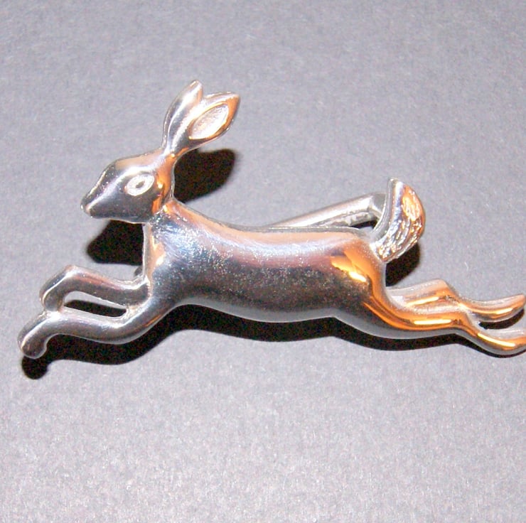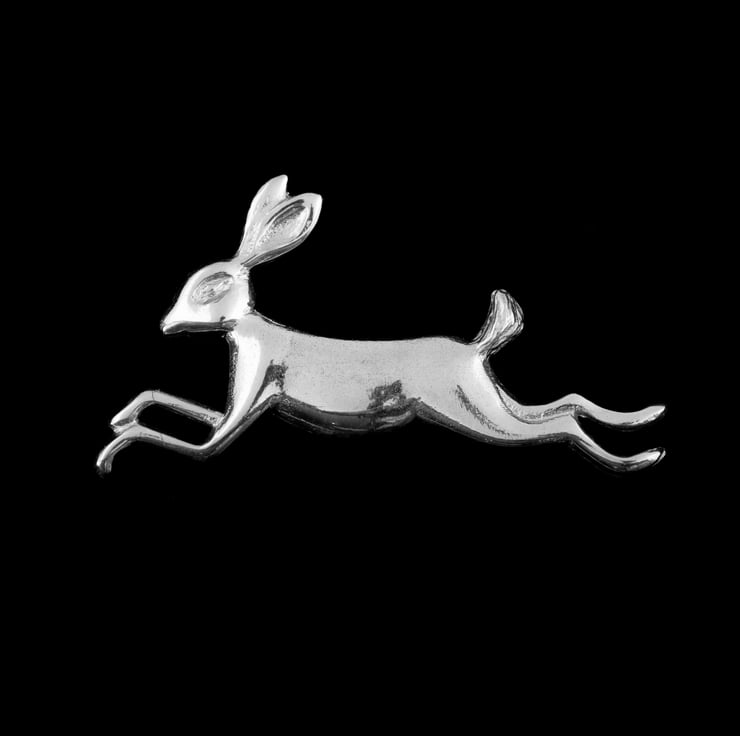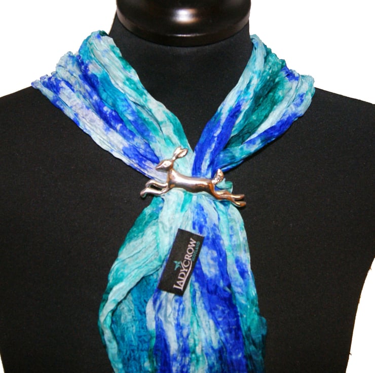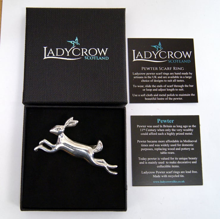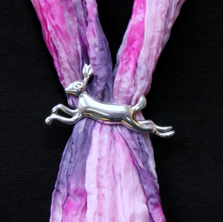 Designed for silk and lightweight scarves this Hare scarf ring has a loop on the back through which to slide the scarf.