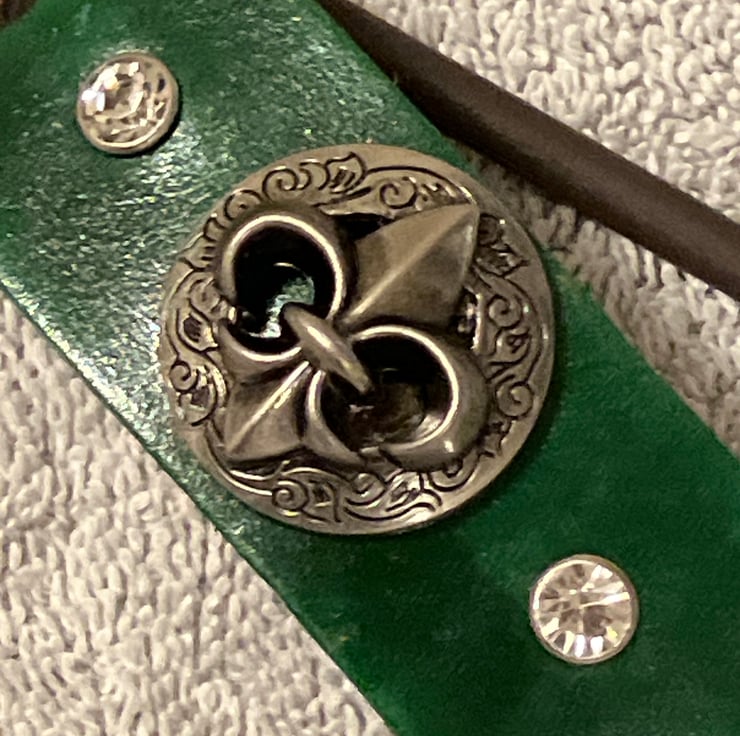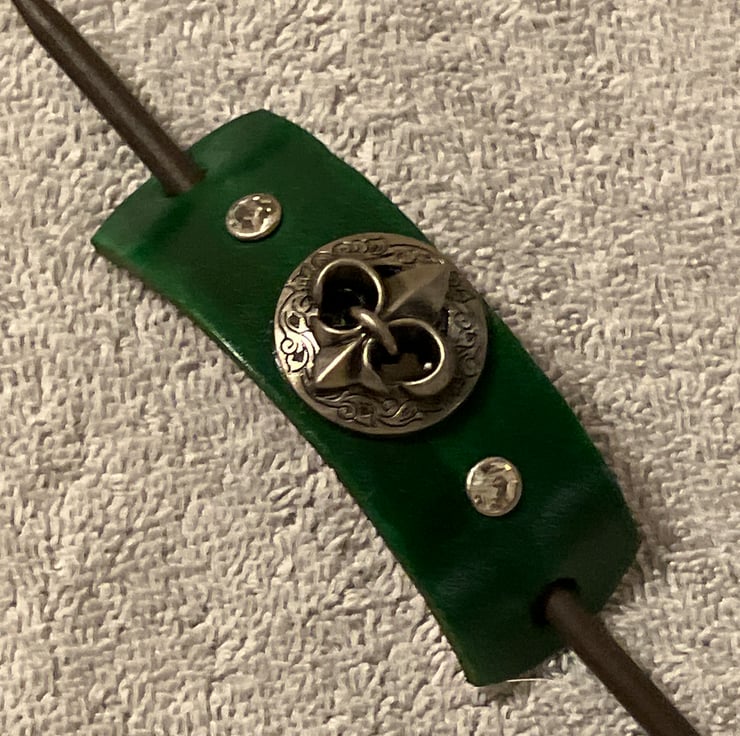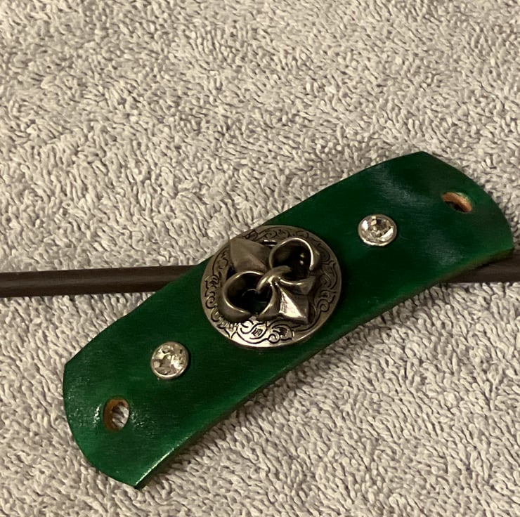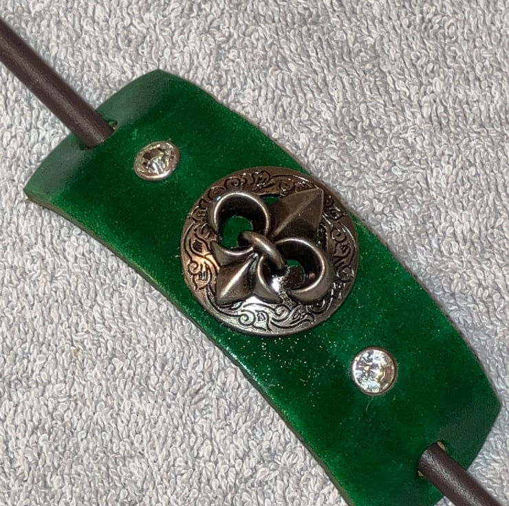Dyed Green Leather Hair Stick Barrette - Fleur de Lis & 2 White Gemstones