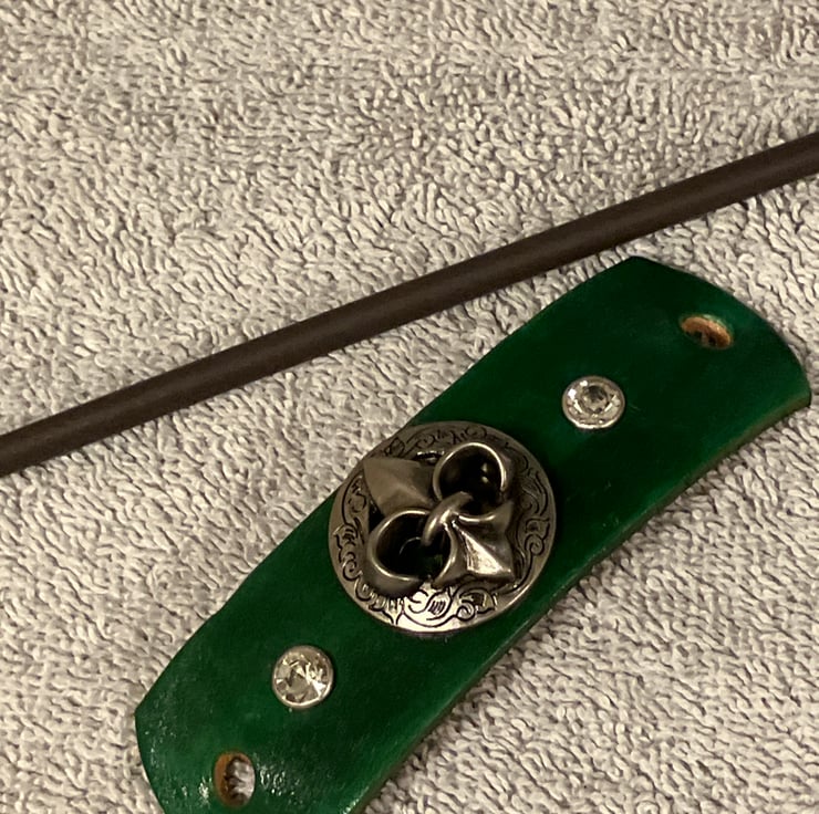 The black wood hair stick is 6" in length. The Fleur de Lis is Nickel in finish and riveted onto the leather rectangle - 2 White Gemstone Rivets flank the concho. (see backside of hair stick barrette)