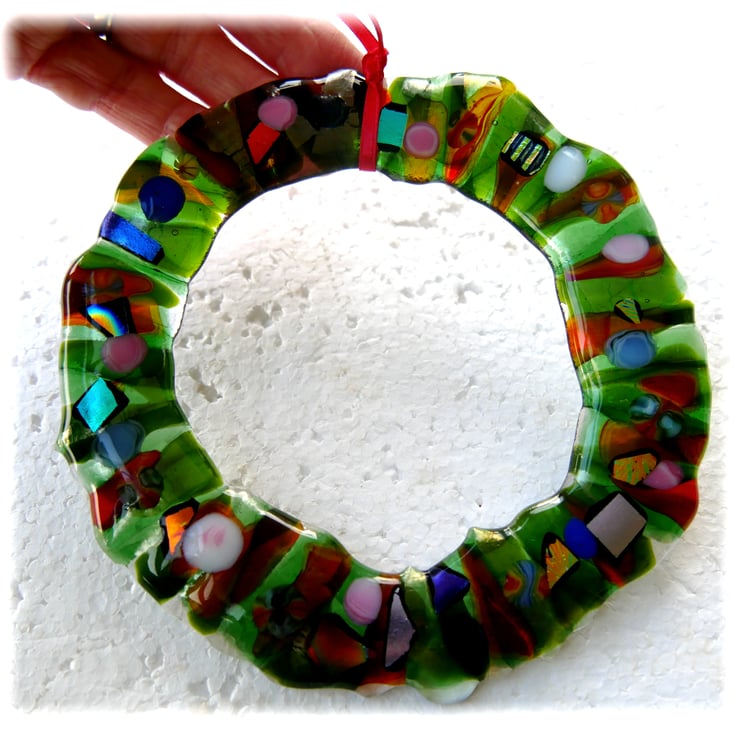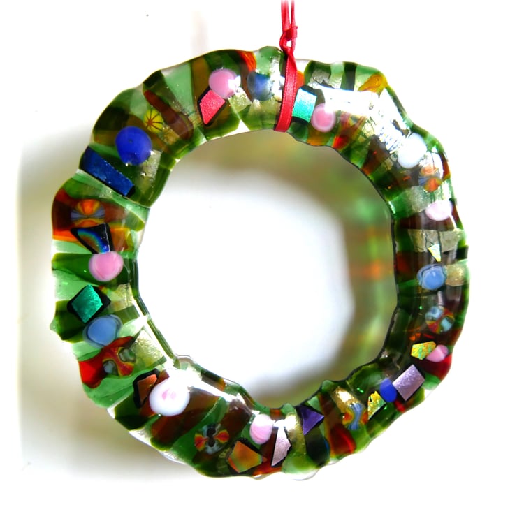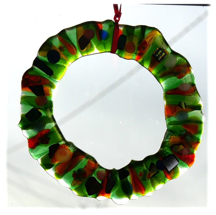 A gorgeous Christmas Wreath part of my Joysofglass Fused Glass collection. All handcut by me, decorated and then fused in my kiln.