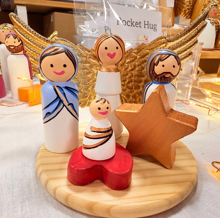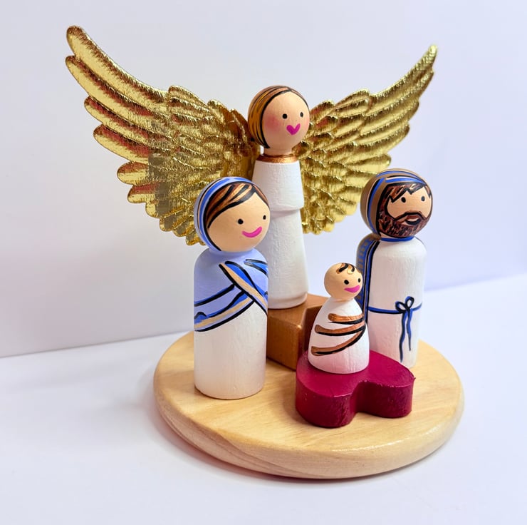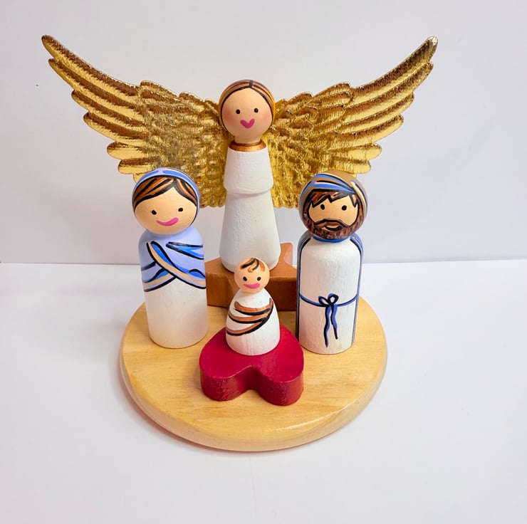 The image shows a wooden nativity-style scene with painted peg dolls. There is a white angel at the back with large sparkling wings, a woman called Mary in blue, a man called Joseph in blue and a tiny baby figure called Jesus on a red heart which represents God’s love for the world. A golden star is included which represents the star the wise men followed. They all sit on a wooden base. All pieces are brightly decorated in a cute, whimsical style. Scandinavian style nativity set.