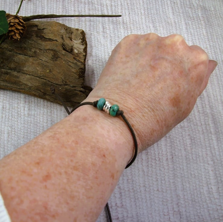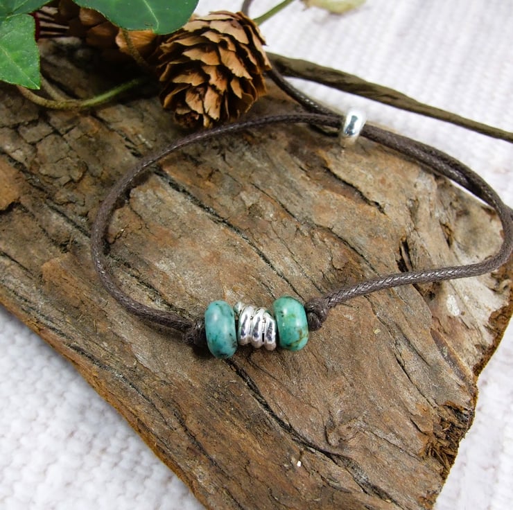 Silver coil bracelet, waxed cotton cord with turquoise and adjustable silver slider closure. Lovely unisex friendship gift.
