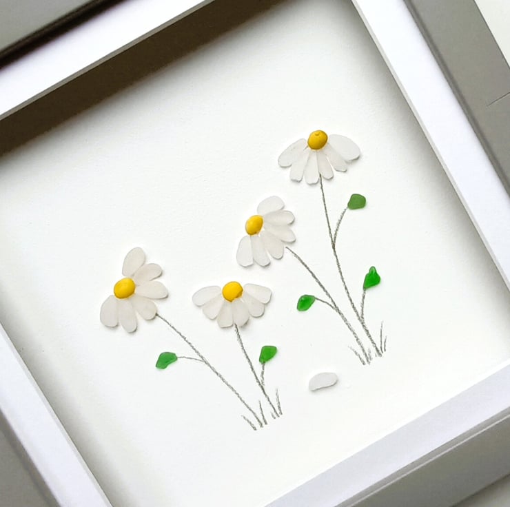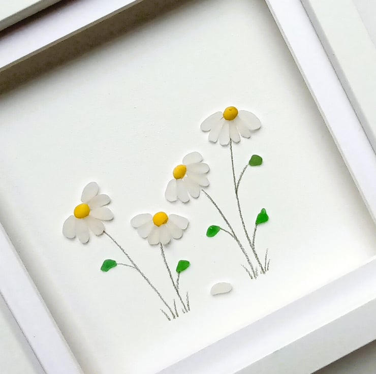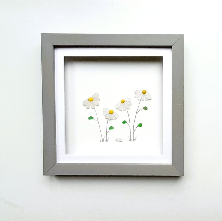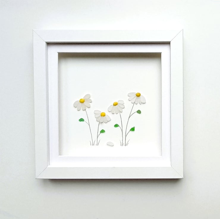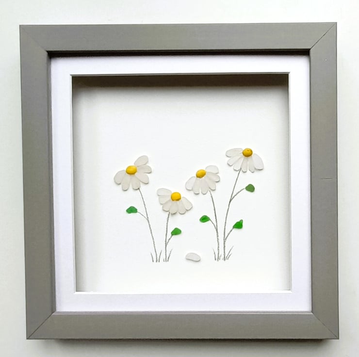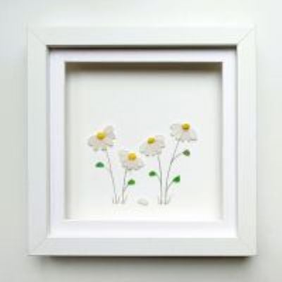 Daisies with delicate petals made from tiny nuggets of perfectly ocean shaped and smoothed Cornish sea glass set inside a 24cm square glazed box frame