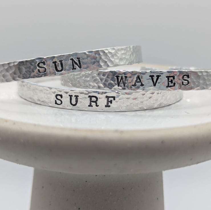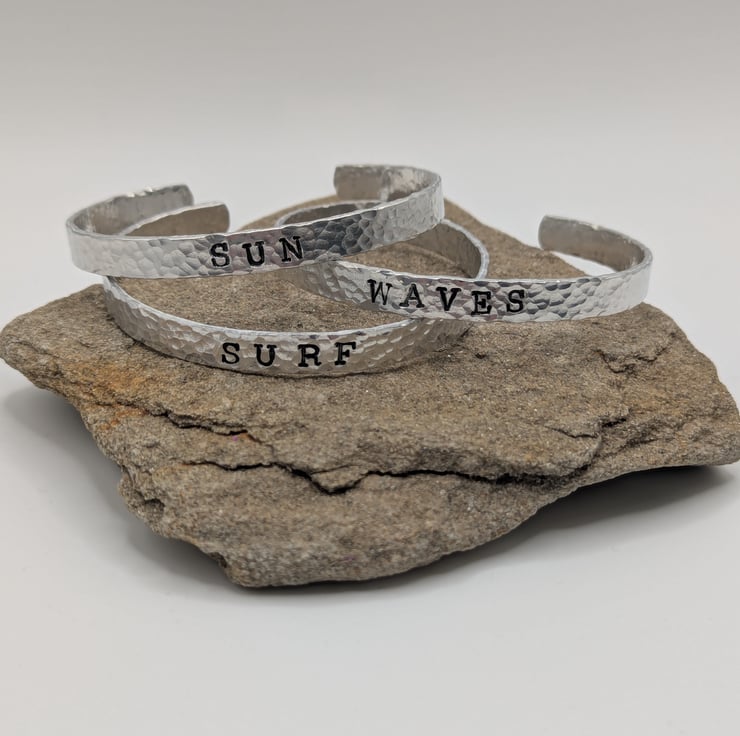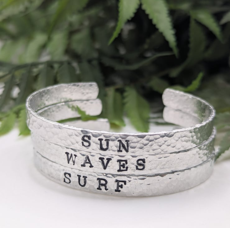 This trio of hand stamped skinny aluminium cuff bangles with 'Sun, Waves, Surf' wording are perfect for everyday wear and would make a great gift for any beach lover.