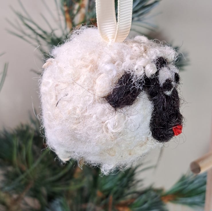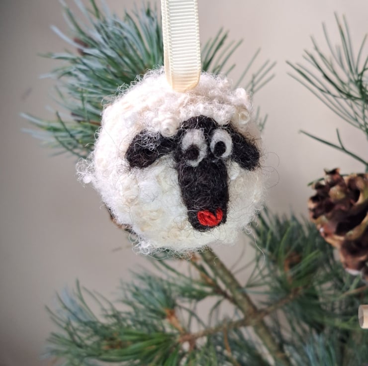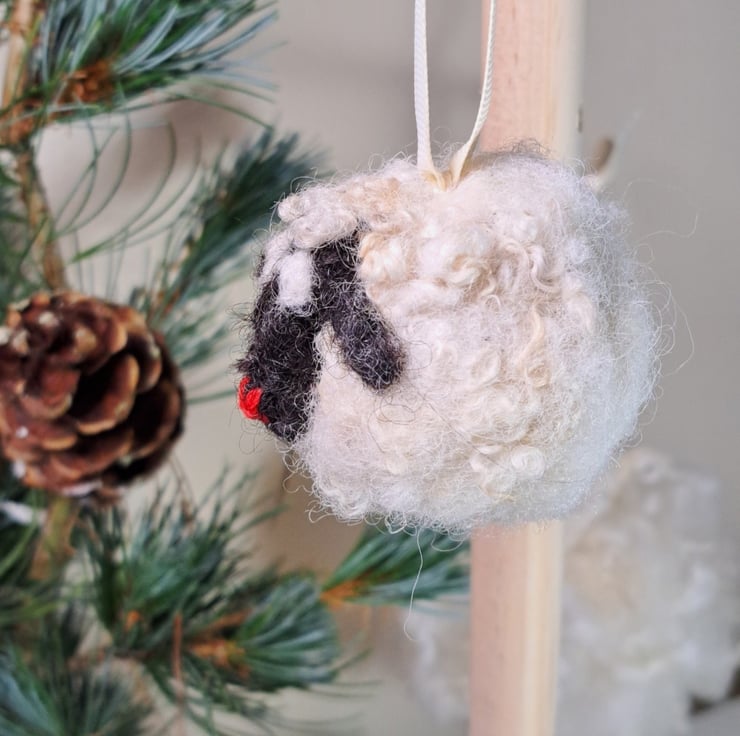 Natural Handmade sheep bauble made with pure British Wool bought directly from local farmers in Staffordshire. No two are alike. Wet felted with needle felted finishing touches.