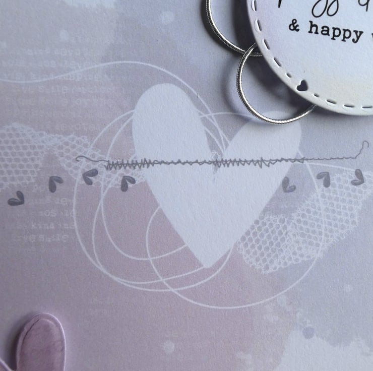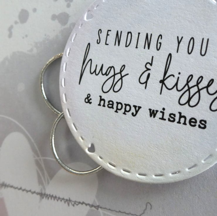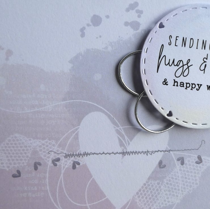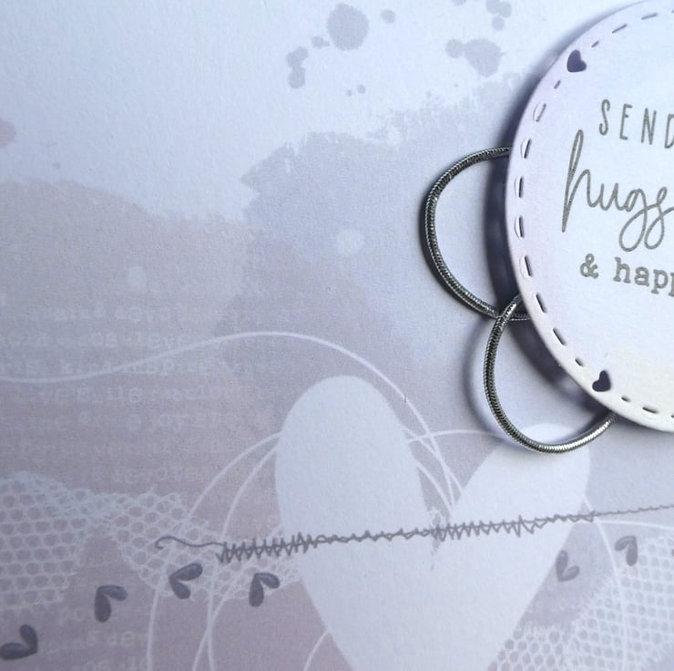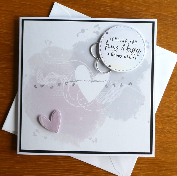 This card in soft shades of dusky pink, lilac and mauve has a heart theme and the message 'sending you hugs & kisses & happy wishes' making it suitable for an engagement card, anniversary, wedding or birthday card.
