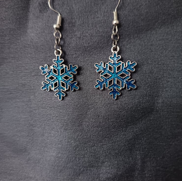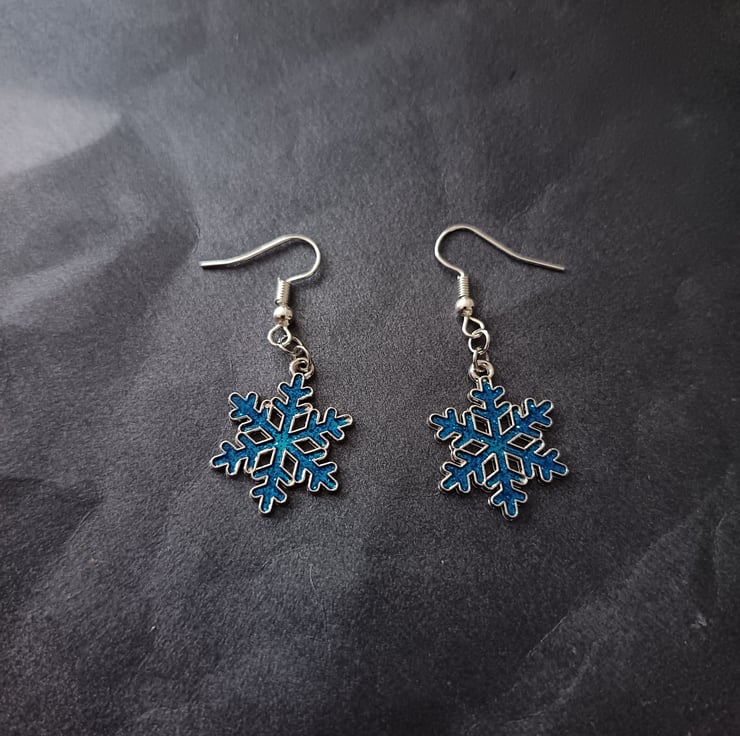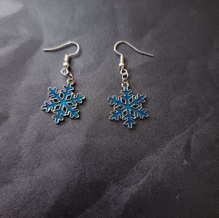 These handmade earrings are crafted with stainless steel hooks and jump rings, featuring blue and silver enamel snowflake charms.