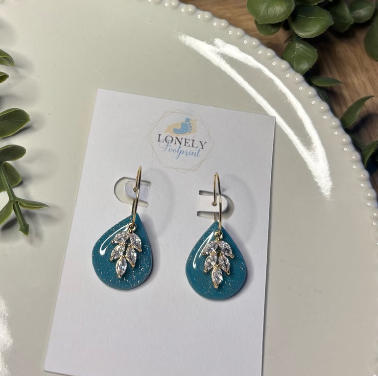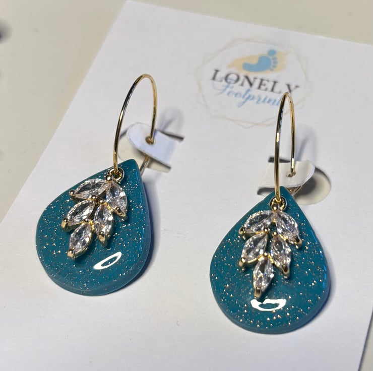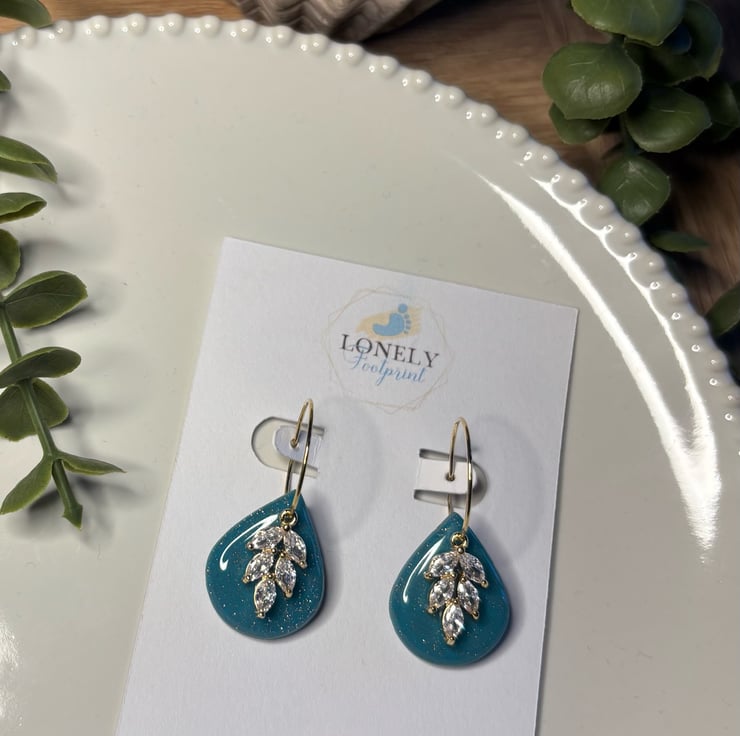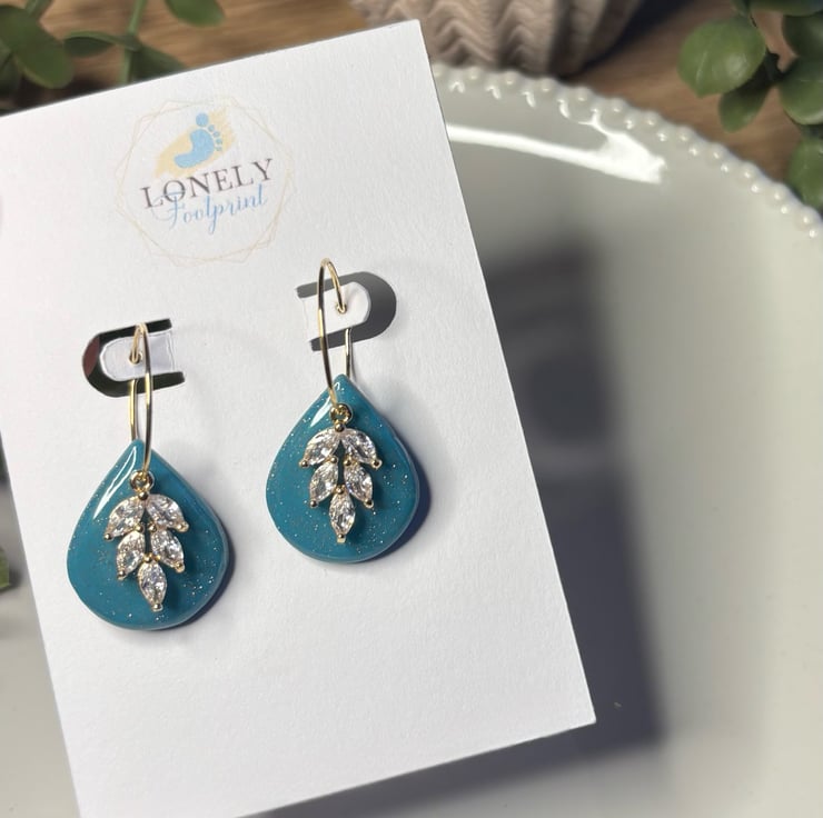 These shimmering teal teardrop hoops are handmade using polymer clay and cubic zirconia charms. Super lightweight and comfy to wear all day, they’re perfect for special occasions, parties, or for gifting to someone special.