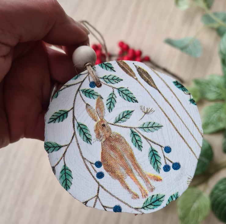 This wood slice hanging decoration has been decorated with decoupage using a lovely woodland hare design. I have sealed it with satin varnish. and finished the decoration with a wooden bead and twine, and it is unsealed on the back. There are two options - crouching hare or standing hare (see pics).
