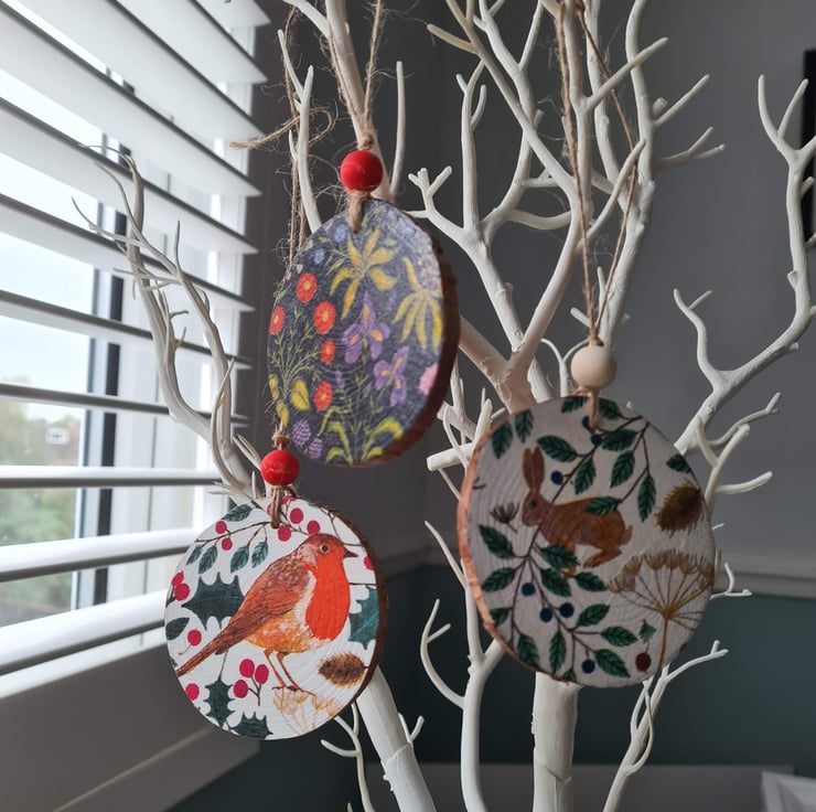 There will be a discounted postage cost for any additional decorations bought together, and there are other designs available, so you could buy a selection if you wanted - see my 'Christmas decorations and gifts' collection. As each item is hand decorated, the decoration you receive may vary slightly to that pictured but will be the same design. Each wood slice is also individual and may be a slightly different size or shape but they are all decorated the same way and look lovely together.