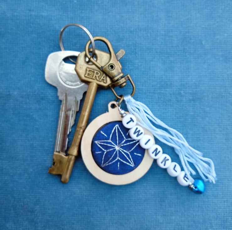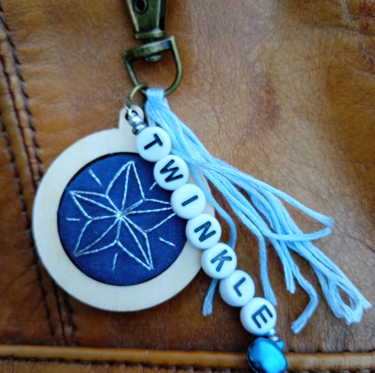 A hand embroidered star keyring/bag charm with the word ‘twinkle’ in letter beads, adorned with coloured beads and a little bell, finished with a pale blue tassel.