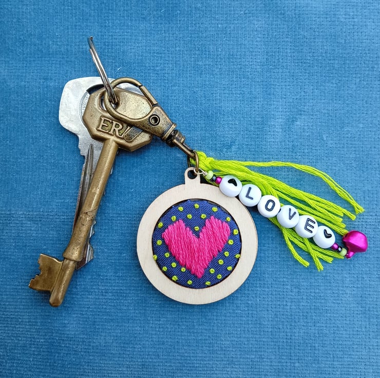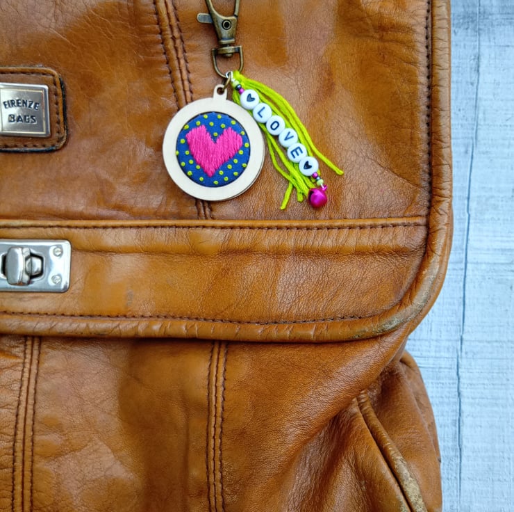 A hand embroidered heart design keyring/bag charm with the word ‘love’ in letter beads, adorned with coloured beads and a little bell, finished with a lime green tassel.
