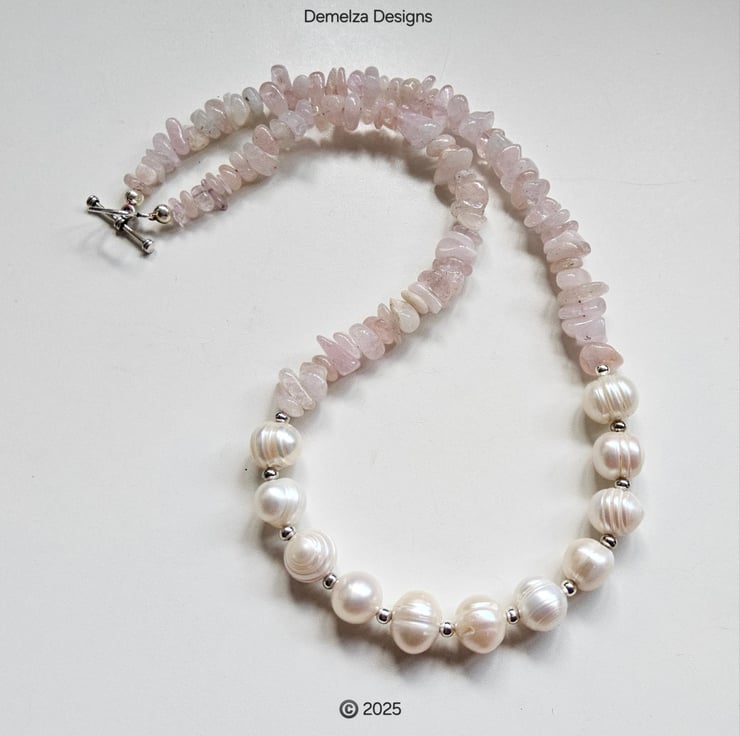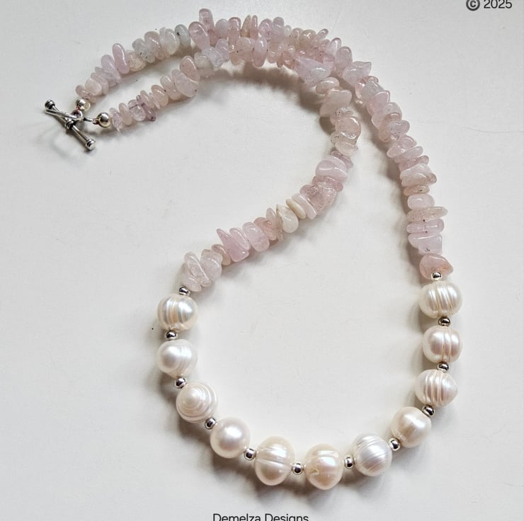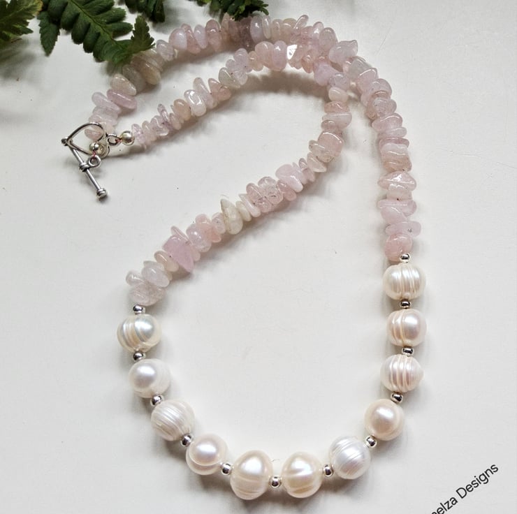 A very organic looking necklace designed and hand crafted in Cornwall by Demelza Designs using genuine untreated tumbled morganite stones with eleven large 10mm (approximately) genuine baroque freshwater culture pearls in the centre.