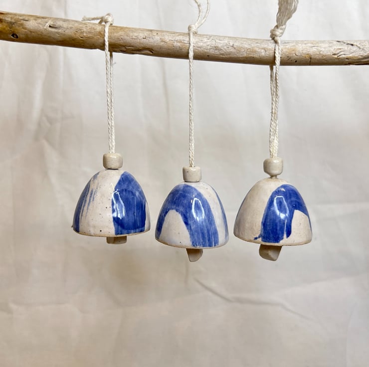 These handmade ceramic bells are part of the Drift series, inspired by coastal shapes and simple, natural movement. Each bell is built by hand from stoneware clay and finished with brushed cobalt-blue markings. The design is minimal, calm, and easy to style in any space.