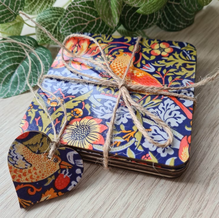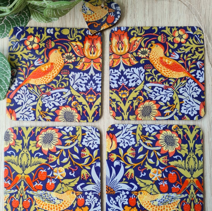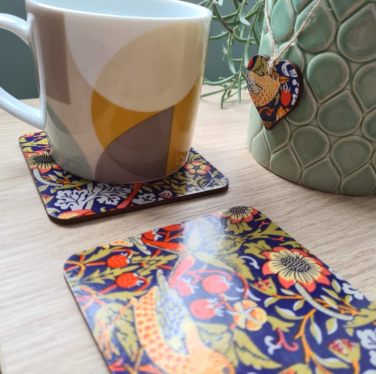 This set of four pretty wooden coasters has been decoupaged using William Morris Strawberry Thief design. Each coaster has a different part from the same design, making a lovely set which would look great with any decor. Add a stylish splash of colour to your table with these coasters.