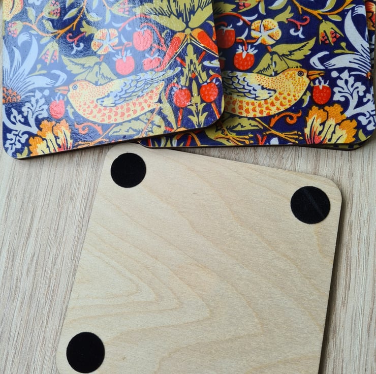 As they have been decorated by hand, there may be some imperfections, which adds to the uniqueness of the coasters. They are made from birch plywood and each one measures 9.5x9.5cm and approx 4mm high including the felt pads on the bottom, which will protect furniture.