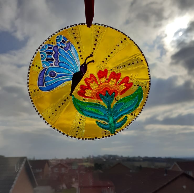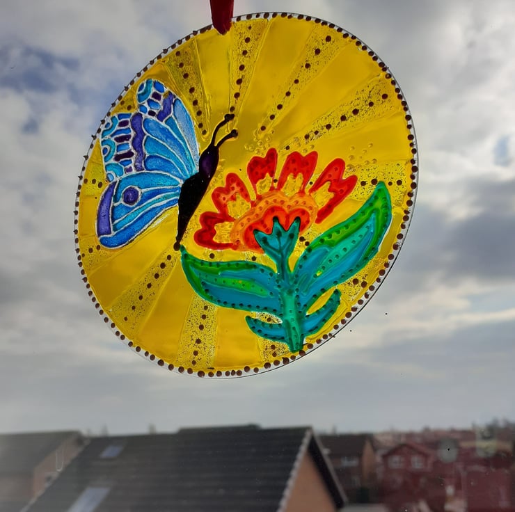 This gorgeous suncatcher is approx. 13cm (5in) in size. It is 3mm thick but is quite robust if handled with care.