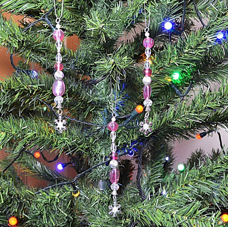 Pretty decorations for your Christmas tree, featuring AB coated pink glass beads, with silver plated beads and swirls, glass crystals, and a sparkly snowflake. The decorations measure approximately 12cm, or 4 3/4 inches, and have a silver split ring hanger, supplied with jewellery elastic loop.