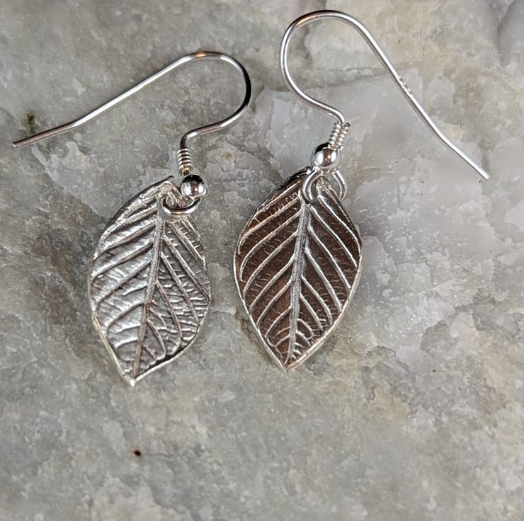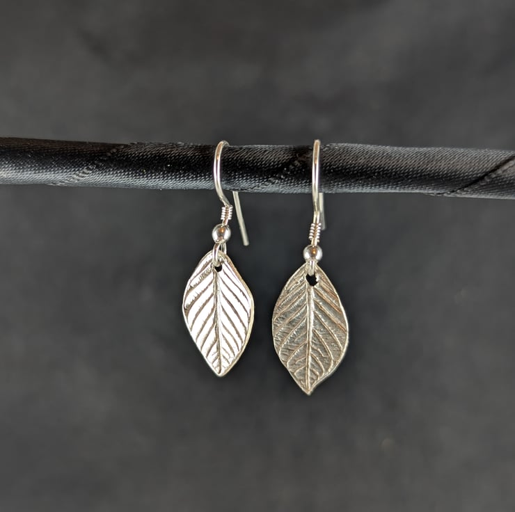 Silver leaf earrings, 10mm wide x 18mm long with silver ear hook finding. The leaf is from the Wayfaring tree. I have made two pairs and as they are handmade, each individual article is slightly different - however they are the same leaves!