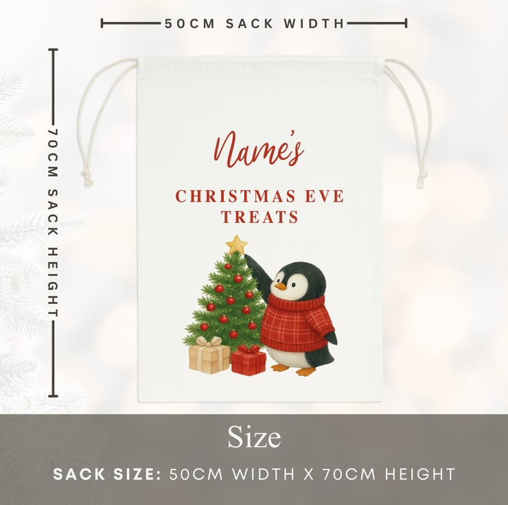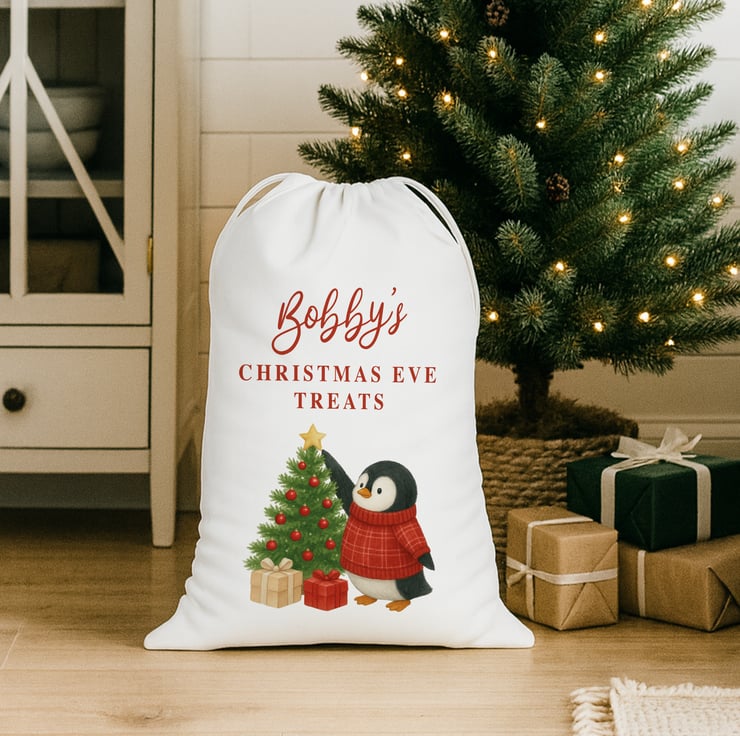 Make Christmas Eve magical with this adorable Penguin Christmas Eve Treat Sack, featuring a cosy winter penguin placing a star on a festive tree. Personalised with any name up to 9 characters, this sack is perfect for children who love cute Christmas characters and bedtime traditions.
